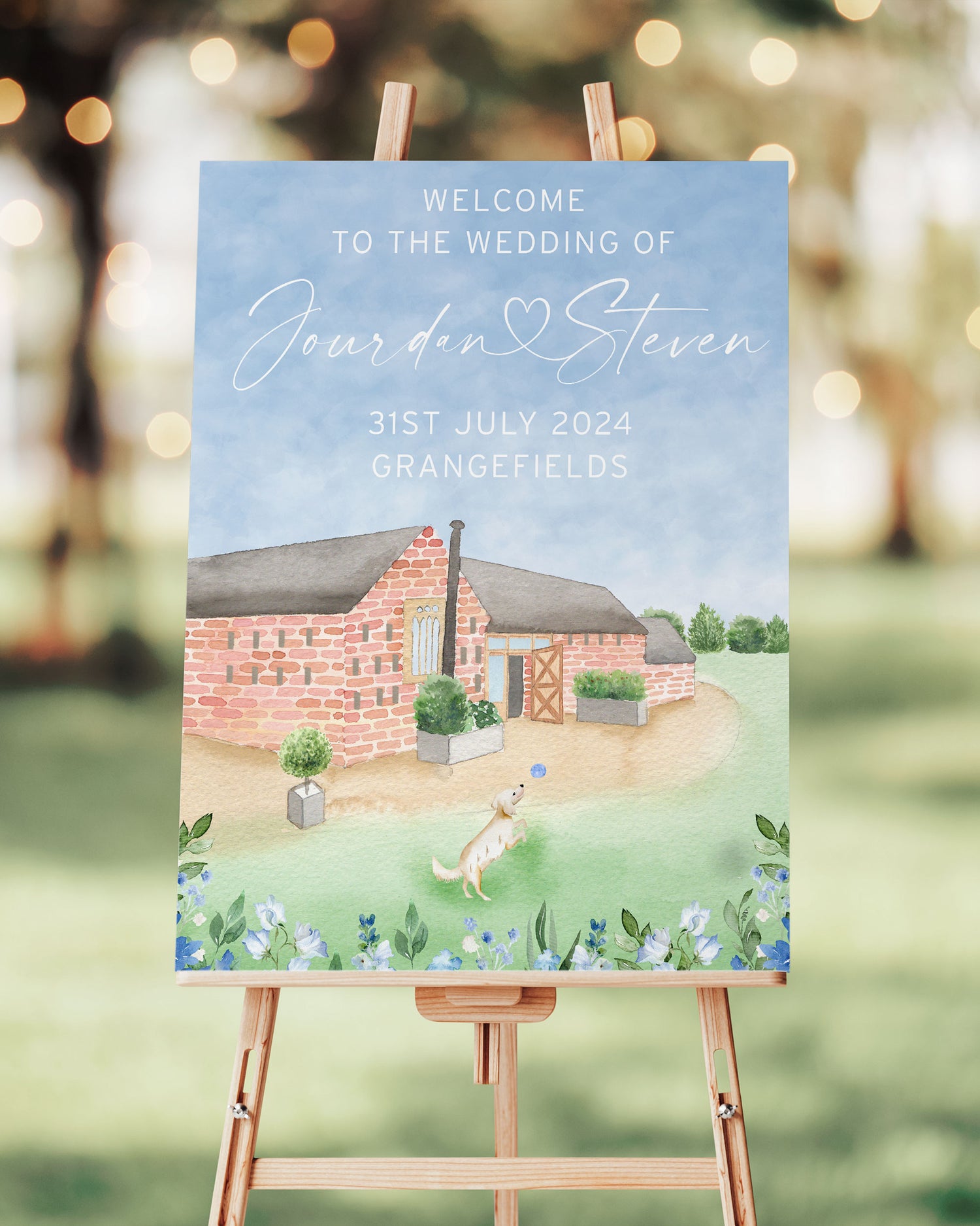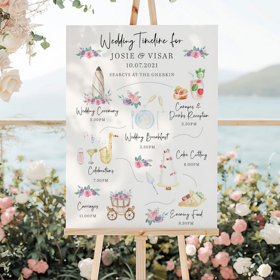 This illustrated 'Order of the Day' board combines charming watercolour artwork with a beautifully crafted timeline to share your wedding’s key moments with guests. From hand-painted illustrations of your wedding cake and entertainment to signature drinks, every detail is tailored to your celebration, making the board a truly unique focal point for your wedding day.