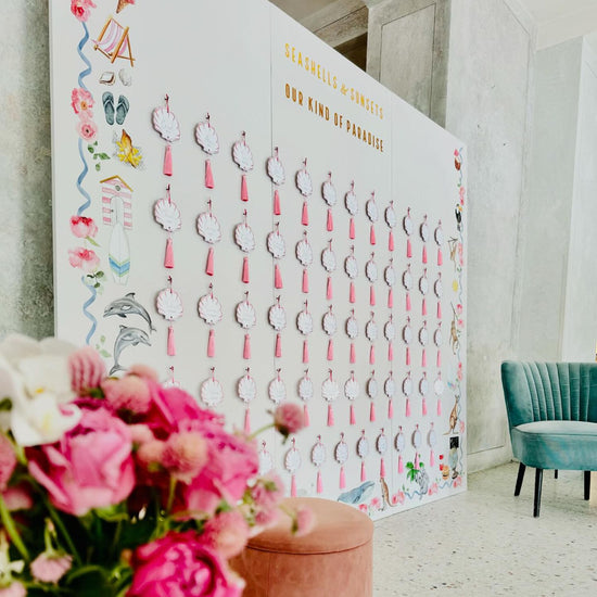 Table plans with a twist! Escort cards offer a modern and stylish way to guide your guests to their seats. Fully customisable in shape and size, each escort card is personalised with the guest's name and table number. The creative possibilities for displaying them are endless! At L&L’s stunning Lake Como wedding, I designed shell-shaped cards with tassels, paired with an illustrated panel that beautifully reflected their travel memories from around the globe.