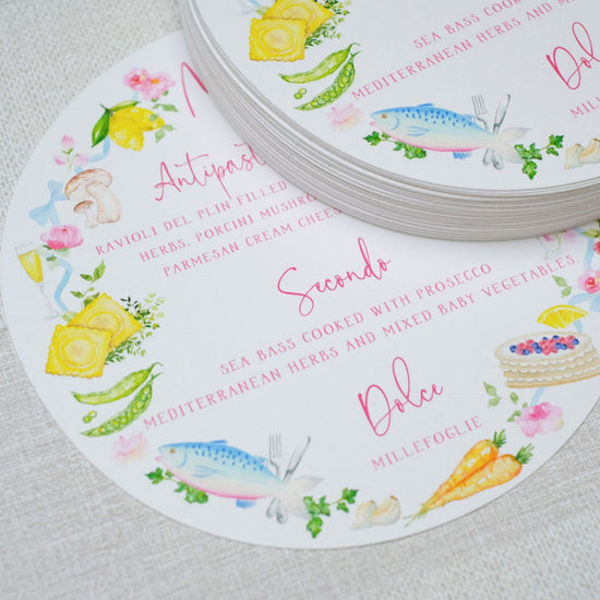 Bespoke wedding menus are a wonderful way to add a touch of personality to your place settings. Get creative with die-cut shapes such as round menus, shells or lobsters for a playful twist. Each menu can also serve as a place card, customised with guest names and meal choices, and decorated with pretty florals, foliage, or ingredients from your wedding menu.