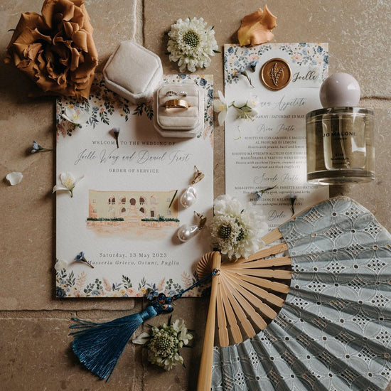 One of the final touches for your wedding day, bespoke order of service booklets are a beautiful way to share your ceremony details while giving guests a heartfelt keepsake. Whether you choose folded cards or booklets, they can be adorned with elegant venue illustrations, delicate florals, and design elements that perfectly complement the rest of your wedding stationery.