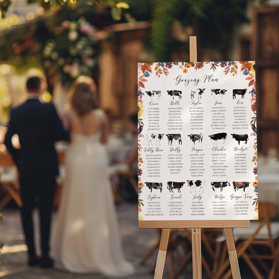 One of the things I love most about my job is the vast range of weddings I get the pleasure of serving, no two projects are the same. This bespoke table plan was created for clients that were farmers and wanted each of their tables to be named after their beloved cows. The edges were decorated with sunflowers, autumn leaves, berries and birds - perfect for an autumn wedding in the countryside.