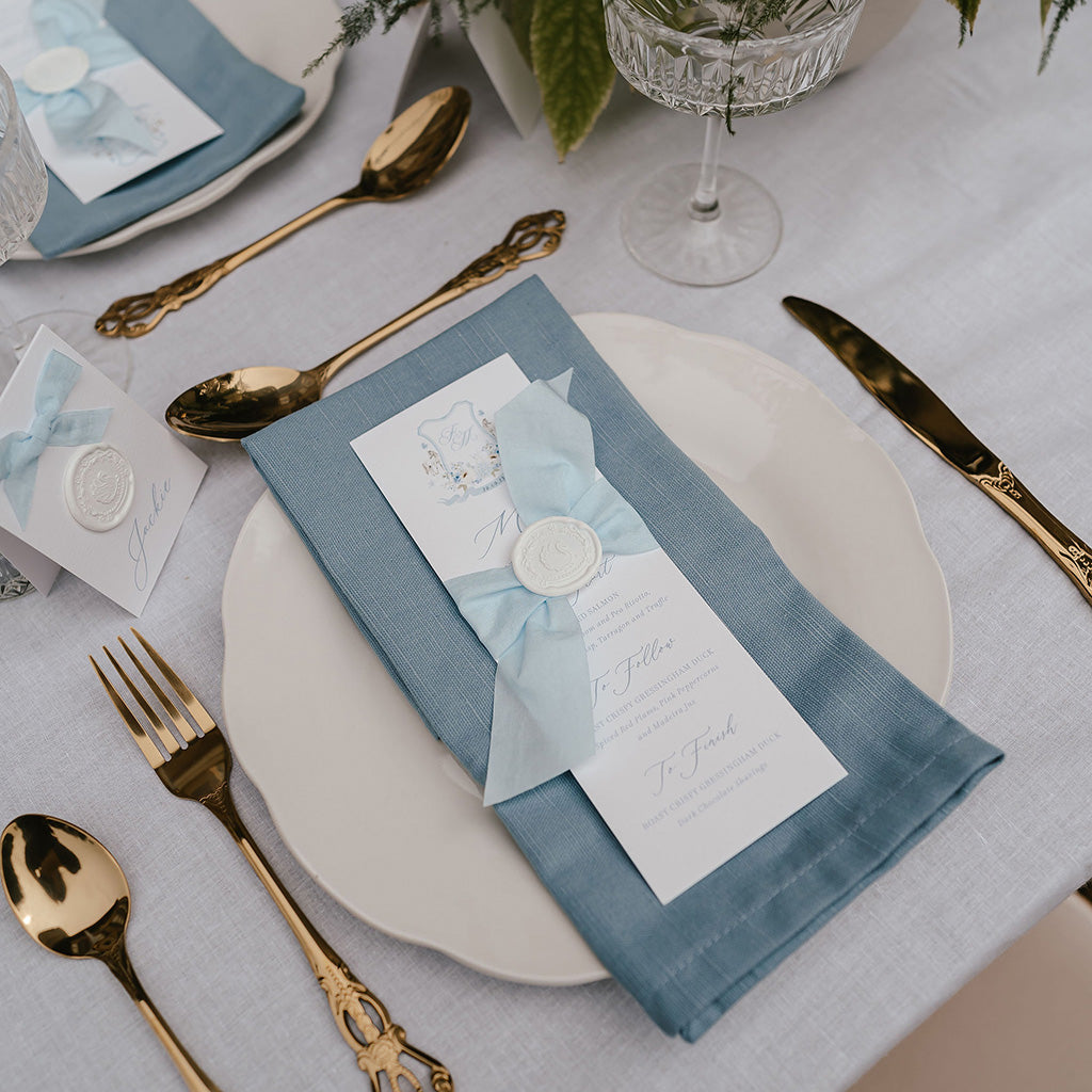 Create curated keepsakes for guests! By adding ribbon and wax seals to your day stationery, you are weaving, intricately beautiful details into your wedding styling. Creating unique statement pieces, that guests will love to keep. I usually use faux silk ribbon with a matt finish which is lovely and floaty. The ribbon and wax seals are available in a range of colours to complement your stationery design.